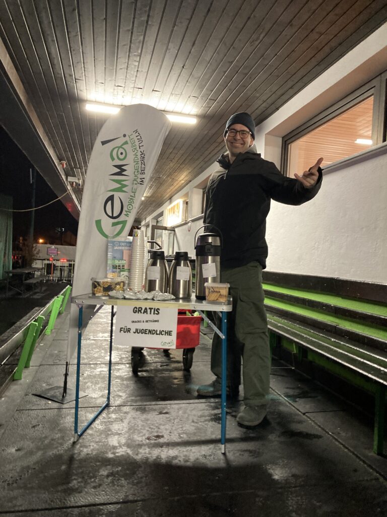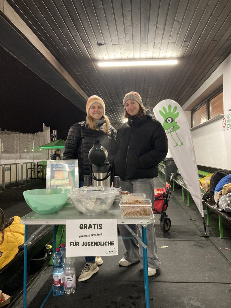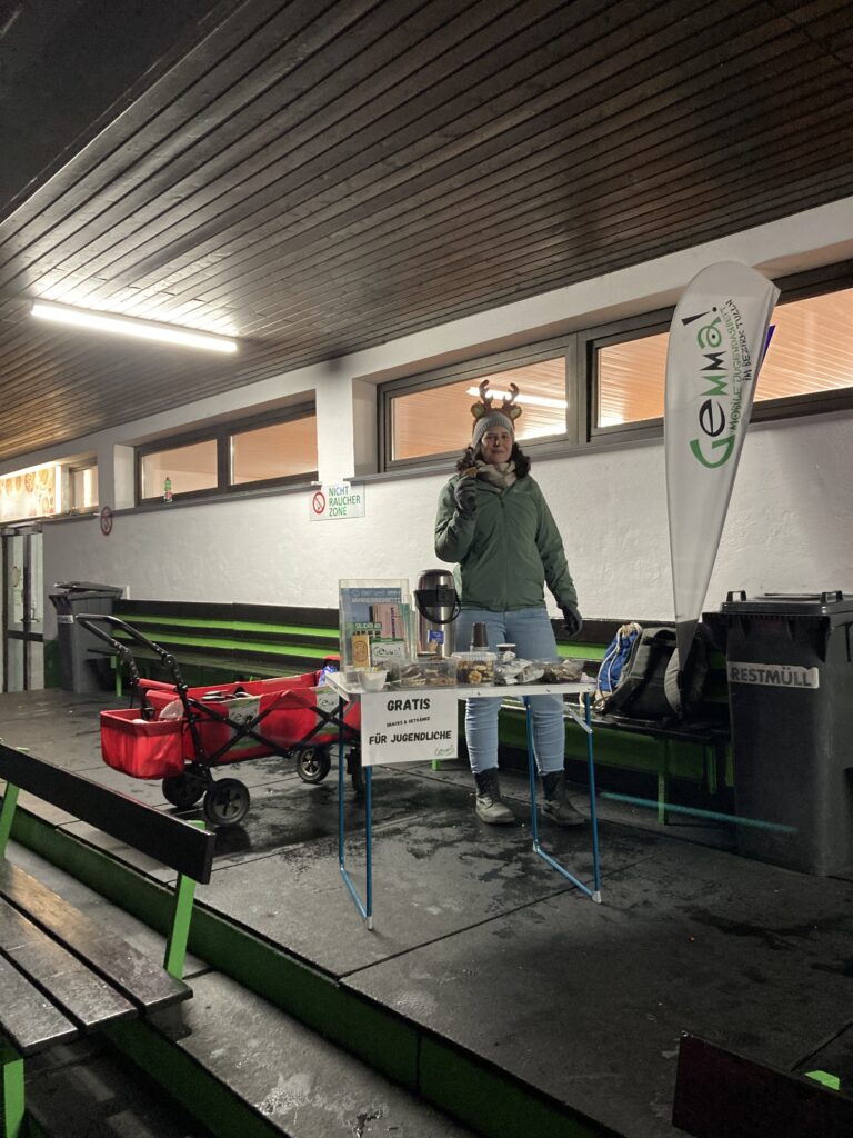 In der Eislauf-Saison 2025/2026 waren wir Gemmas, wie auch in den letzten Jahren, wieder einige Male bei der Eisdisco am Start. Das Event ist jedes Mal sehr gut besucht – um die 200 Jugendliche stürmen samstags das Eis. Die Eisdisco fand diesen Winter an sechs Samstagen statt. Vier Mal davon bauten wir uns mit unserem Gemma!-Stand auf um heißen Tee und Snacks an Jugendliche zu verteilen. So konnten wir viele Jugendliche und auch Eltern auf uns und unsere Angebote aufmerksam machen. Auch trafen wir sehr viele bekannte Gesichter und es ergaben sich gute Gespräche.
